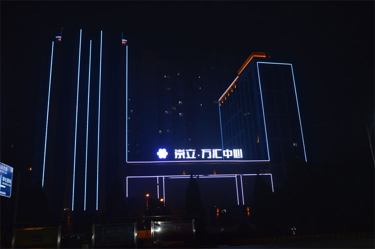 亮化樓體左側(cè)立面效果,主體采用線條燈勾勒輪廓,十字星光燈點(diǎn)綴測樓體