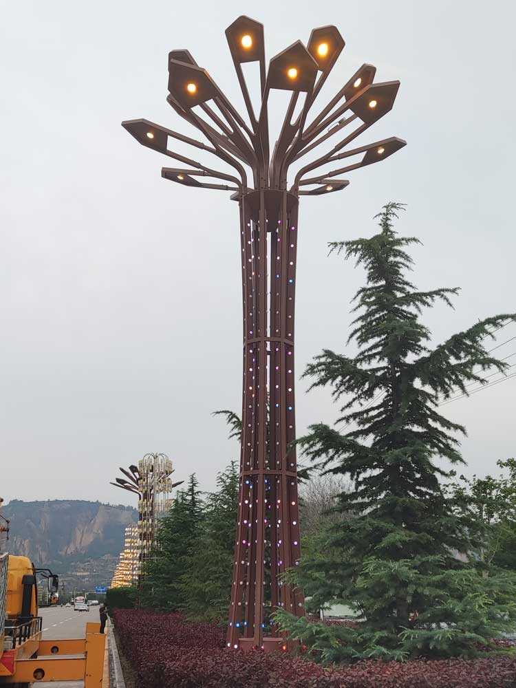 簡介—— 甘肅平涼9米景觀燈項目,安裝位于崆峒山下的市政道路倆側,主光源采用16個LED模組光源組成,配合燈體400的RGB點光源構成,系統采用512控制,夜晚整體趁現炫彩效果,亮化倆側道路。